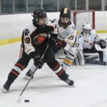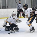 Norwin goalie Damien Flore turns away a shot during the Knights’ game against Latrobe on Monday, at PPI Arena in Delmont.