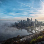 Fogs are seen on the Alleghany River in downtown Pittsburgh on Monday.