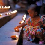 A child touches an oil lap that are used to decorate the surroundings of a temple during Diwali celebration, in Dhaka, Bangladesh, on Monday.