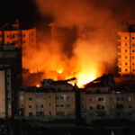 Flame and smoke rises from buildings hit by Israeli airstrikes on Dahiyeh, on Wednesday, in the southern suburb of Beirut.