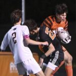 Latrobe’s Roman Agostoni battles Bethel Park’s Cooper Kicinski for a header during their WPIAL Class 3A quarterfinal on Wednesday, at Latrobe.