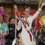 President Claudia Sheinbaum waves to supporters in the Zócalo, Mexico City’s main square, on Tuesday, during a rally on her inauguration day.
