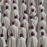 A bishop uses a smartphone as Pope Francis presides over a mass in St. Peter’s Square, at the Vatican, on Wednesday, for the opening of the second session of the 16th General Assembly of the Synod of Bishops.