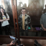 Russian journalists, from left: Konstantin Gabov, Antonina Favorskaya, Artyom Kriger and Sergey Karelin, accused of working for a group founded by the late Russian opposition politician Alexei Navalny, on Wednesday, stand in a defendant’s cage of the Nagatinsky District Court in Moscow, Russia.