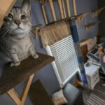 Farley, a Silver Tabby cat rest on a porch as owner Gina Henry, rigs a motivation toy, on Tuesday, at her Springdale home.