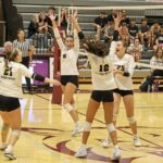 Quaker Valley girls volleyball players celebrate a point during the 2024 season.