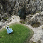 A drone view shows Cholita golfer Martha Mamani, one of the last Aymara women practising the sport wearing traditional pollera skirts, playing at La Paz Golf Club during her free time, in La Paz, Bolivia, Monday.