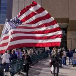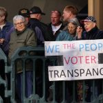 People wait to enter as a woman stands in protest outside the Maricopa County Board of Supervisors auditorium prior to the board’s general election canvass meeting in Phoenix.