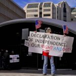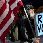 A man protests outside the Maricopa County Board of Supervisors auditorium prior to the board’s general election canvass meeting, Monday, Nov. 28, 2022, in Phoenix.