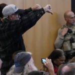 A man gives the thumbs down to the Maricopa County Board of Supervisors during their general election canvass meeting, Monday, Nov. 28, 2022, in Phoenix.