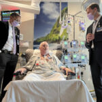 Dr. Girish Mour, left, medical director of Mayo Clinic’s Larynx and Trachea Transplant Program, and Dr. David Lott, right, standing on either side of Marty Kedian one week after his transplant surgery in Phoenix, March 8, 2024.