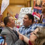 From July 11, 2023: Pastor Michael Shover of Christ the Redeemer Church (left) argues with Ryan Maher of Des Moines, Iowa, as protestors voice opposition to a new ban on abortion after roughly six weeks of pregnancy introduced by Republican lawmakers in a special session.