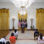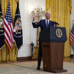 The scene for Biden’s press conference was very different from what Americans are used to seeing at such events. The president still stood behind a podium in the East Room against a backdrop of flags. But due to the pandemic, the White House limited attendance and only 30 socially distanced chairs for journalists were spread out in the expansive room.