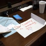 Protesters outside the chamber held up signs that said, “School zones shouldn’t be war zones,” “Muskets didn’t fire 950 rounds per minute” with a photo of George Washington, and “You can silence a gun … but not the voice of the people.“