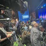 Local and national media prepare for a speech by Vice President Kamala Harris on the CMU campus at the Philip Chosky Theater Monday in Pittsburgh.
