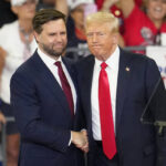 Republican vice presidential candidate Sen. JD Vance, R-Ohio, left, and Republican presidential candidate former President Donald Trump, shake hands at a campaign rally in Atlanta, Aug. 3, 2024.