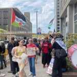 Biden’s visit attracted critics. About 50 pro-Palestinian protesters gathered along the Boulevard of the Allies across from the steelworkers building, many carrying signs or flags showing their support for Palestine.