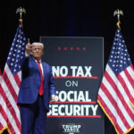 Trump spoke at Harrah’s Cherokee Center, an auditorium in downtown Asheville, with his podium flanked by more than a dozen American flags and custom backdrops that read: “No tax on Social Security” and “No tax on tips” — a made-for-TV setup to project the policy heft his campaign wanted Trump to convey.