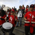 Drums, whistles, shouts and honks from supportive drivers echoed through downtown as groups of teachers and backers walked to a rally that drew thousands to Grand Park near City Hall.