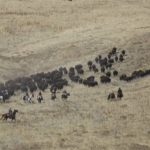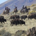 Riders herd bison during the annual bison roundup Saturday, Oct. 26, 2019, on Antelope Island in Utah. Hundreds of horseback riders are conducting the annual roundup of bison on the island in Utah’s Great Salt Lake. The roundup on Antelope Island is conducted over three fall weekends, with the first devoted to the actual roundup and the next two to health checks and vaccinations and to releasing the animals or selling some to keep the herd’s size manageable.