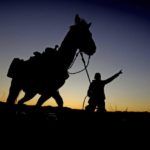 A rider climbs on his horse before the start of the annual bison roundup Saturday, Oct. 26, 2019, on Antelope Island in Utah. Hundreds of horseback riders are conducting the annual roundup of bison on the island in Utah’s Great Salt Lake.