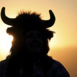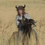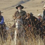 KyAnn Betz wears her bison hat during the annual bison roundup Saturday, Oct. 26, 2019, on Antelope Island in Utah. Hundreds of horseback riders are conducting the annual roundup of bison on the island in Utah’s Great Salt Lake.