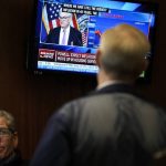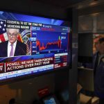Traders on the floor at the New York Stock Exchange watch Federal Reserve Chair Jerome Powell’s news conference after the Federal Reserve interest rate announcement in New York.