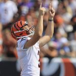 Cincinnati Bengals kicker Evan McPherson (2) points skyward after making a field goal from over 50 yards against the Minnesota Vikings during the second half of an NFL football game, Sunday, Sept. 12, 2021, in Cincinnati.