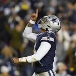Dallas Cowboys quarterback Dak Prescott (4) points upward after scoring against Washington Commanders during the first half an NFL football game, Sunday, Jan. 8, in Landover, Md. While its Super Bowl commercial appearances are few, religion – Christianity especially – is entrenched in football culture.