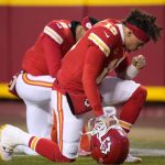 Kansas City Chiefs quarterback Patrick Mahomes prays before the NFL AFC Championship playoff football game against the Cincinnati Bengals, Sunday, Jan. 29, in Kansas City, Mo.