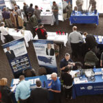 In this March 7, 2019, photo visitors to the Pittsburgh veterans job fair meet with recruiters at Heinz Field in Pittsburgh. On Friday, May 3, the U.S. government issues the April jobs report.
