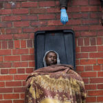 Henry sits in a trash bin as he and other homeless people rest at the Caledonian stadium in downtown Pretoria, South Africa, Thursday April 2, 2020, after being rounded up by police in an effort to enforce a 21-day lockdown to control the spread of the coronavirus. Many of those who are addicts are receiving methadone syrup from a local NGO, and some were complaining about the lack of sanitizer and soap. (AP Photo/Jerome Delay)