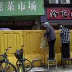 Residents climb onto chairs to buy groceries from vendors behind barriers used to seal off a neighborhood in Wuhan in central China’s Hubei province on Friday, April 3, 2020. Sidewalk vendors wearing face masks and gloves sold pork, tomatoes, carrots and other vegetables to shoppers Friday in the city where the coronavirus pandemic began as workers prepared for a national memorial this weekend for health workers and others who died in the outbreak. (AP Photo/Ng Han Guan)