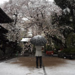 A man takes pictures of cherry blossoms at a shrine as snow falls Sunday, March 29, 2020, in Tokyo. Tokyo Gov. Yuriko Koike has asked the city’s 13 million residents to stay home this weekend, saying the capital is on the brink of an explosion in virus infections. (AP Photo/Jae C. Hong)