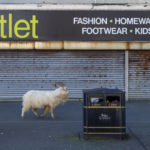 A goat walks past a closed stored near Trinity Square in Llandudno, north Wales, Tuesday March 31, 2020. A group of goats have been spotted walking around the deserted streets of the seaside town during the nationwide lockdown due to the coronavirus. (Pete Byrne/PA via AP)