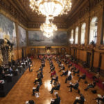 First Mayor Peter Tschentscher, standing at lectern, speaks during a meeting of the municipal parliament practicing social distancing in City Hall in Hamburg, Germany, Wednesday, April 1, 2020. (Christian Charisius/dpa via AP)