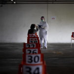 A nurse in protective clothing takes notes from a woman with symptoms of new coronavirus at a carpark that turned into a COVID-19 infection screening center at Chulalongkorn University health service center in Bangkok, Thailand, Wednesday, April 1, 2020. (AP Photo/Gemunu Amarasinghe)