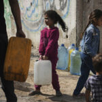 Children carrying empty bottles raced after a water tanker in a devastated area of northern Gaza on Sunday. Residents of the built-up Shati refugee camp said the water was brought by a charity from elsewhere in Gaza. Without it, they rely on wells that are salty and often polluted.