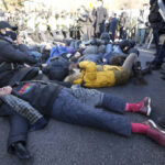 Supporters of impeached South Korean President Yoon Suk Yeol lie on the ground as Yoon faces potential arrest after a court approved a warrant for his arrest, near the presidential residence in Seoul, South Korea.