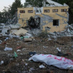 A Hamas militant in a body bag is seen Wednesday in Kibbutz Be’eri, Israel. The kibbutz was overrun by Hamas militants from Neraby Gaza Strip on Saturday when they killed and captured many Israelis.