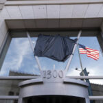 The U.S. flag flying alone beside an empty flagpole that previously had the flag of the U.S. Agency for International Development, or USAID, is seen Feb. 7 in the reflection of a window that previously had the sign and the seal of USAID, outside the agency’s headquarters in Washington.