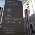 The U.S. Agency for International Development sign is seen outside of USAID headquarters in Washington.