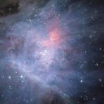 One of the brightest nebulae in the night sky is Messier 42, the Orion Nebula, located south of Orion’s belt. At its core is the young Trapezium Cluster of stars, the most massive of which illuminate the surrounding gas and dust with their intense ultraviolet radiation fields, while proto-stars continue to form today in the OMC-1 molecular cloud behind.