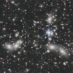 The infrared image shows data from NASA’s James Webb Space Telescope. It features scores of seemingly tiny celestial objects in a sea of black. This is the galaxy cluster Abell 2744. When magnified, the tiny white, orange, and purple celestial objects are revealed to be spiral and elliptical galaxies, and gleaming stars.
