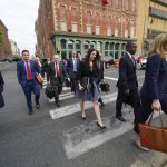 Attorney Justin Nelson, second right, representing Dominion Voting Systems arrive at the New Castle County Courthouse in Wilmington, Del., for the Dominion Voting Systems defamation lawsuit against Fox News.