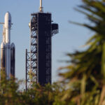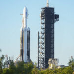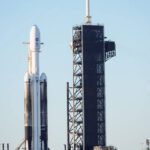 A SpaceX Falcon Heavy rocket with a NASA spacecraft bound for Jupiter stands ready for launch today on pad 39A at the Kennedy Space Center Monday in Cape Canaveral, Fla.