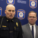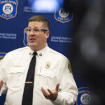 Eric Winstrom, Grand Rapids Police Chief, details an arson during a press conference Monday at the GRPD headquarters in Grand Rapids, Mich.