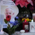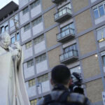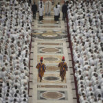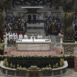 Archbishop Rino Fisichella, center, celebrates a mass for the jubilee of deacons Sunday, in St. Peter’s Basilica at The Vatican that was supposed to be presided over by Pope Francis who was admitted over a week ago at Rome’s Agostino Gemelli Polyclinic and is in critical conditions.