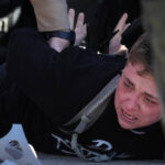 Just moments before the clash, demonstrators were singing and chanting. Around 10 a.m., a large group, knowing they were going to be arrested, allegedly crossed the protest barrier and attempted to walk up toward the U.S. Immigration and Customs Enforcement facility.