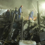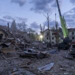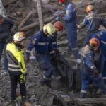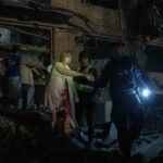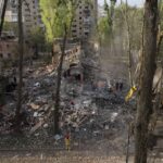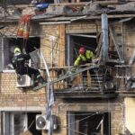 In Kyiv’s Sviatoshynskyi district, the attack flattened a two-story residential building and heavily damaged nearby multi-story buildings. Rescue work continued through the morning.